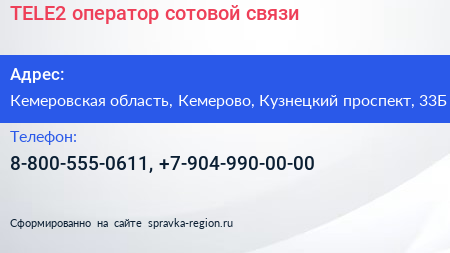 TELE2, оператор сотовой связи по адресу Кемеровская область, Кемерово, Кузнецкий проспект, 33Б в дальнейшем Организация, размещена в следующих категориях:
