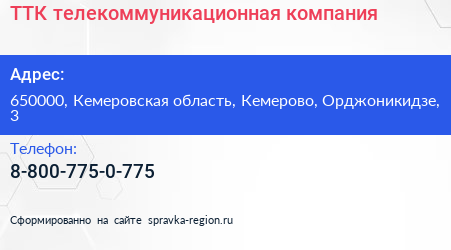 ТТК, телекоммуникационная компания по адресу 650000, Кемеровская область, Кемерово, Орджоникидзе, 3 в дальнейшем Организация, размещена в следующих категориях: