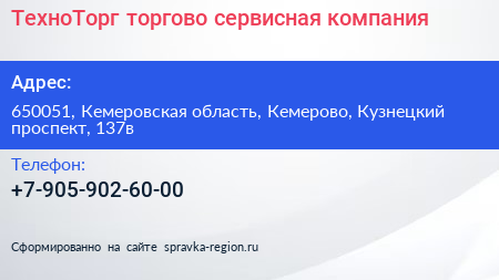 ТехноТорг, торгово-сервисная компания по адресу 650051, Кемеровская область, Кемерово, Кузнецкий проспект, 137в в дальнейшем Организация, размещена в следующих категориях: