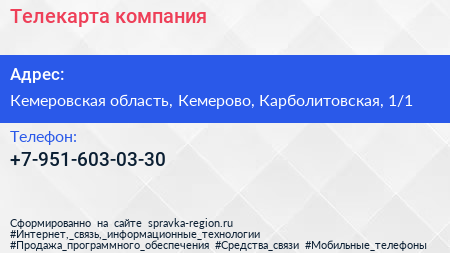 Телекарта, компания по адресу Кемеровская область, Кемерово, Карболитовская, 1/1 в дальнейшем Организация, размещена в следующих категориях: