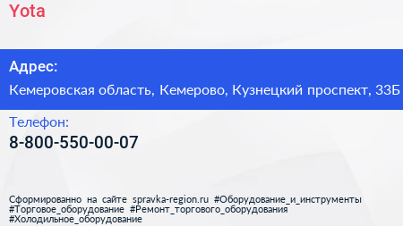 Yota по адресу Кемеровская область, Кемерово, Кузнецкий проспект, 33Б в дальнейшем Организация, размещена в следующих категориях: