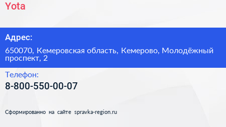 Yota по адресу 650070, Кемеровская область, Кемерово, Молодёжный проспект, 2 в дальнейшем Организация, размещена в следующих категориях: