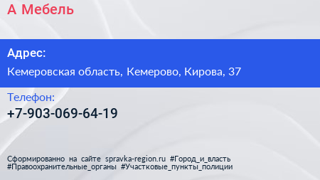 А-Мебель по адресу Кемеровская область, Кемерово, Кирова, 37 в дальнейшем Организация, размещена в следующих категориях: