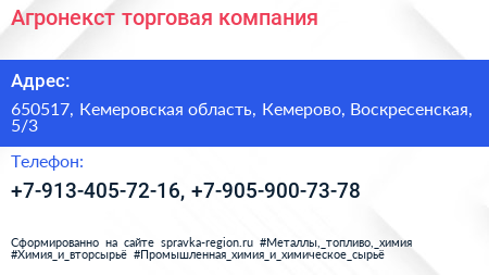 Агронекст, торговая компания по адресу 650517, Кемеровская область, Кемерово, Воскресенская, 5/3 в дальнейшем Организация, размещена в следующих категориях: