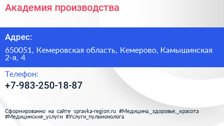 Академия производства по адресу 650051, Кемеровская область, Кемерово, Камышинская 2-я, 4 в дальнейшем Организация, размещена в следующих категориях: