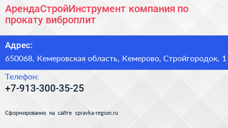 АрендаСтройИнструмент, компания по прокату виброплит по адресу 650068, Кемеровская область, Кемерово, Стройгородок, 1 в дальнейшем Организация, размещена в следующих категориях:
