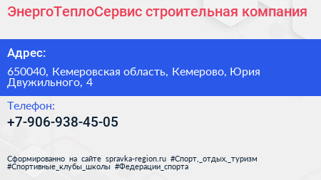 ЭнергоТеплоСервис, строительная компания по адресу 650040, Кемеровская область, Кемерово, Юрия Двужильного, 4 в дальнейшем Организация, размещена в следующих категориях: