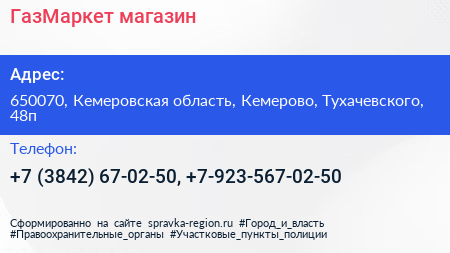 ГазМаркет, магазин по адресу 650070, Кемеровская область, Кемерово, Тухачевского, 48п в дальнейшем Организация, размещена в следующих категориях: