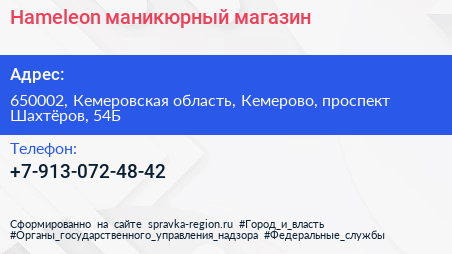 Hameleon, маникюрный магазин по адресу 650002, Кемеровская область, Кемерово, проспект Шахтёров, 54Б в дальнейшем Организация, размещена в следующих категориях: