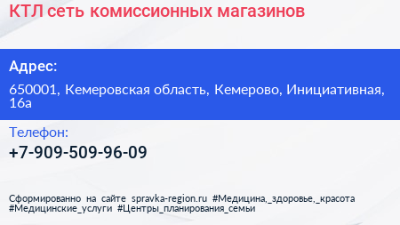 КТЛ, сеть комиссионных магазинов по адресу 650001, Кемеровская область, Кемерово, Инициативная, 16а в дальнейшем Организация, размещена в следующих категориях: