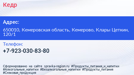 Кедр по адресу 650010, Кемеровская область, Кемерово, Клары Цеткин, 120/1 в дальнейшем Организация, размещена в следующих категориях: