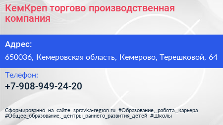 КемКреп, торгово-производственная компания по адресу 650036, Кемеровская область, Кемерово, Терешковой, 64 в дальнейшем Организация, размещена в следующих категориях: