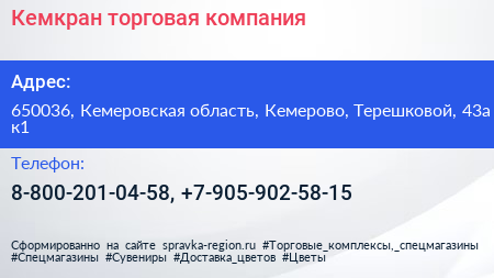 Кемкран, торговая компания по адресу 650036, Кемеровская область, Кемерово, Терешковой, 43а к1 в дальнейшем Организация, размещена в следующих категориях:
