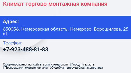 Климат, торгово-монтажная компания по адресу 650056, Кемеровская область, Кемерово, Ворошилова, 25 к1 в дальнейшем Организация, размещена в следующих категориях: