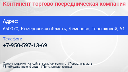Континент, торгово-посредническая компания по адресу 650070, Кемеровская область, Кемерово, Терешковой, 51 в дальнейшем Организация, размещена в следующих категориях: