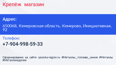 Крепёж+, магазин по адресу 650068, Кемеровская область, Кемерово, Инициативная, 92 в дальнейшем Организация, размещена в следующих категориях: