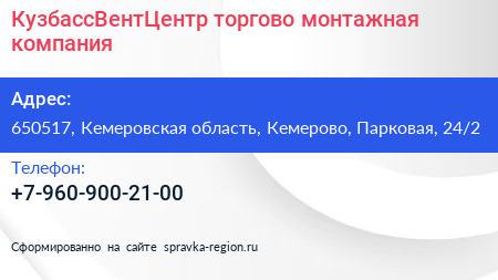 КузбассВентЦентр, торгово-монтажная компания по адресу 650517, Кемеровская область, Кемерово, Парковая, 24/2 в дальнейшем Организация, размещена в следующих категориях: