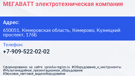 МЕГАВАТТ, электротехническая компания по адресу 650051, Кемеровская область, Кемерово, Кузнецкий проспект, 176Б в дальнейшем Организация, размещена в следующих категориях:
