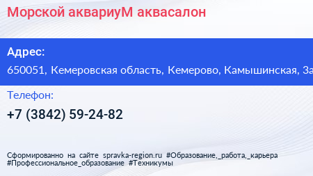Морской аквариуМ, аквасалон по адресу 650051, Кемеровская область, Кемерово, Камышинская, 3а в дальнейшем Организация, размещена в следующих категориях: