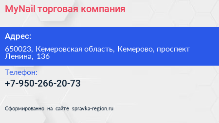 MyNail, торговая компания по адресу 650023, Кемеровская область, Кемерово, проспект Ленина, 136 в дальнейшем Организация, размещена в следующих категориях: