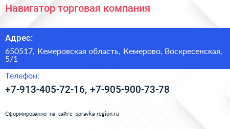 Навигатор, торговая компания по адресу 650517, Кемеровская область, Кемерово, Воскресенская, 5/1 в дальнейшем Организация, размещена в следующих категориях: