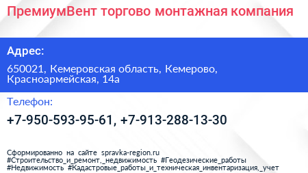 ПремиумВент, торгово-монтажная компания по адресу 650021, Кемеровская область, Кемерово, Красноармейская, 14а в дальнейшем Организация, размещена в следующих категориях: