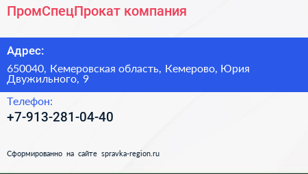 ПромСпецПрокат, компания по адресу 650040, Кемеровская область, Кемерово, Юрия Двужильного, 9 в дальнейшем Организация, размещена в следующих категориях:
