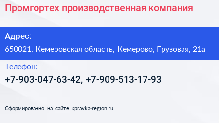 Промгортех, производственная компания по адресу 650021, Кемеровская область, Кемерово, Грузовая, 21а в дальнейшем Организация, размещена в следующих категориях: