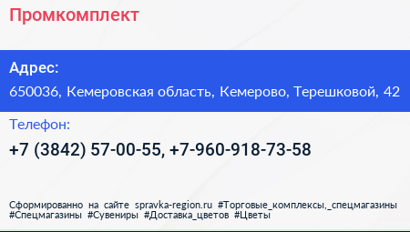 Промкомплект по адресу 650036, Кемеровская область, Кемерово, Терешковой, 42 в дальнейшем Организация, размещена в следующих категориях: