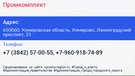 Промкомплект по адресу 650060, Кемеровская область, Кемерово, Ленинградский проспект, 21 в дальнейшем Организация, размещена в следующих категориях: