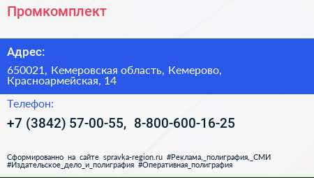Промкомплект по адресу 650021, Кемеровская область, Кемерово, Красноармейская, 14 в дальнейшем Организация, размещена в следующих категориях: