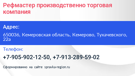 Рефмастер, производственно-торговая компания по адресу 650036, Кемеровская область, Кемерово, Тухачевского, 22а в дальнейшем Организация, размещена в следующих категориях:
