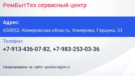 РемБытТех, сервисный центр по адресу 650052, Кемеровская область, Кемерово, Герцена, 51 в дальнейшем Организация, размещена в следующих категориях: