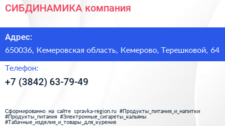 СИБДИНАМИКА, компания по адресу 650036, Кемеровская область, Кемерово, Терешковой, 64 в дальнейшем Организация, размещена в следующих категориях: