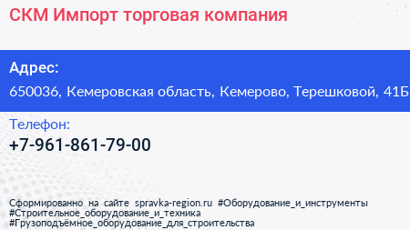 СКМ-Импорт, торговая компания по адресу 650036, Кемеровская область, Кемерово, Терешковой, 41Б в дальнейшем Организация, размещена в следующих категориях: