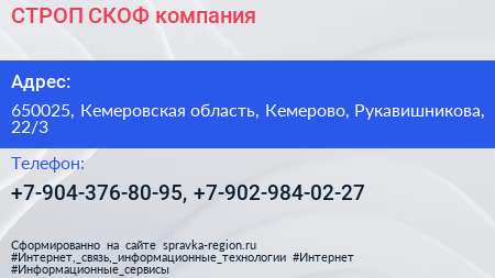 СТРОП-СКОФ, компания по адресу 650025, Кемеровская область, Кемерово, Рукавишникова, 22/3 в дальнейшем Организация, размещена в следующих категориях: