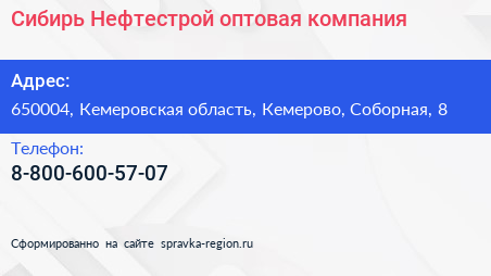 Сибирь-Нефтестрой, оптовая компания по адресу 650004, Кемеровская область, Кемерово, Соборная, 8 в дальнейшем Организация, размещена в следующих категориях:
