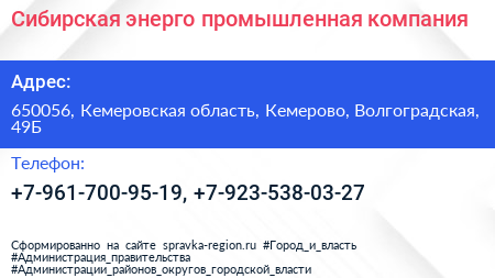 Сибирская энерго-промышленная компания по адресу 650056, Кемеровская область, Кемерово, Волгоградская, 49Б в дальнейшем Организация, размещена в следующих категориях: