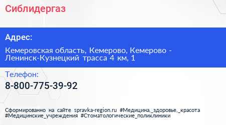 Сиблидергаз по адресу Кемеровская область, Кемерово, Кемерово - Ленинск-Кузнецкий трасса 4 км, 1 в дальнейшем Организация, размещена в следующих категориях: