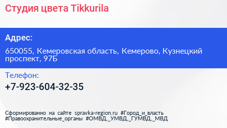 Студия цвета Tikkurila по адресу 650055, Кемеровская область, Кемерово, Кузнецкий проспект, 97Б в дальнейшем Организация, размещена в следующих категориях: