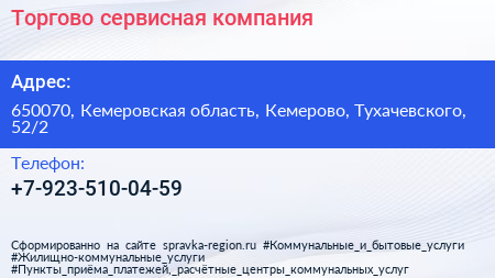 Торгово-сервисная компания по адресу 650070, Кемеровская область, Кемерово, Тухачевского, 52/2 в дальнейшем Организация, размещена в следующих категориях: