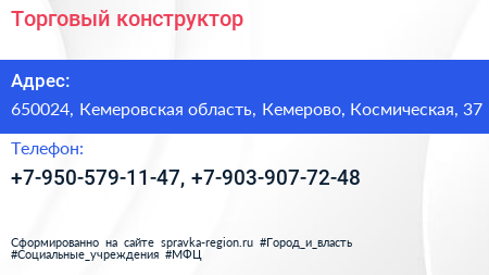 Торговый конструктор по адресу 650024, Кемеровская область, Кемерово, Космическая, 37 в дальнейшем Организация, размещена в следующих категориях: