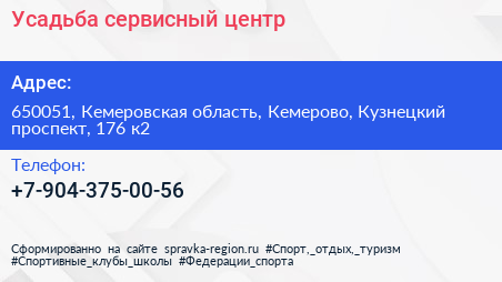Усадьба, сервисный центр по адресу 650051, Кемеровская область, Кемерово, Кузнецкий проспект, 176 к2 в дальнейшем Организация, размещена в следующих категориях: