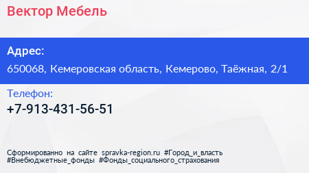 Вектор Мебель по адресу 650068, Кемеровская область, Кемерово, Таёжная, 2/1 в дальнейшем Организация, размещена в следующих категориях: