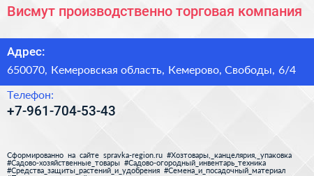 Висмут, производственно-торговая компания по адресу 650070, Кемеровская область, Кемерово, Свободы, 6/4 в дальнейшем Организация, размещена в следующих категориях: