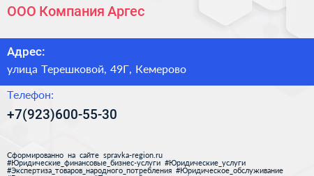 ООО Компания «Аргес» по адресу улица Терешковой, 49Г, Кемерово в дальнейшем Организация, размещена в следующих категориях: