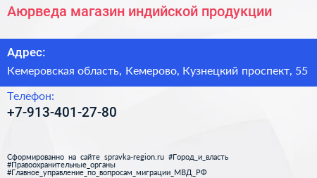 Аюрведа, магазин индийской продукции по адресу Кемеровская область, Кемерово, Кузнецкий проспект, 55 в дальнейшем Организация, размещена в следующих категориях:
