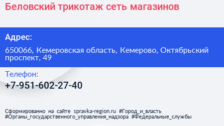 Беловский трикотаж, сеть магазинов по адресу 650066, Кемеровская область, Кемерово, Октябрьский проспект, 49 в дальнейшем Организация, размещена в следующих категориях: