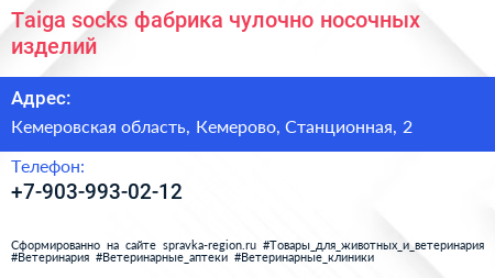 Taiga socks, фабрика чулочно-носочных изделий по адресу Кемеровская область, Кемерово, Станционная, 2 в дальнейшем Организация, размещена в следующих категориях: