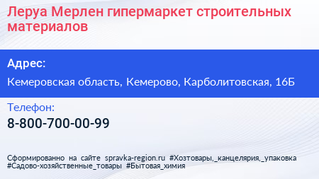Леруа Мерлен, гипермаркет строительных материалов по адресу Кемеровская область, Кемерово, Карболитовская, 16Б в дальнейшем Организация, размещена в следующих категориях: